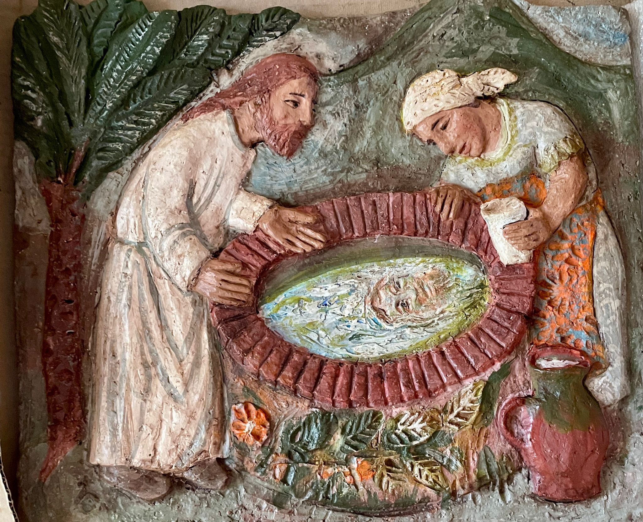 Bas-relief: Le Puits de la rencontre. Céramique de Soeur Mercedes. Abbaye Bénédictine sainte Scholastique, Dourgne (81).